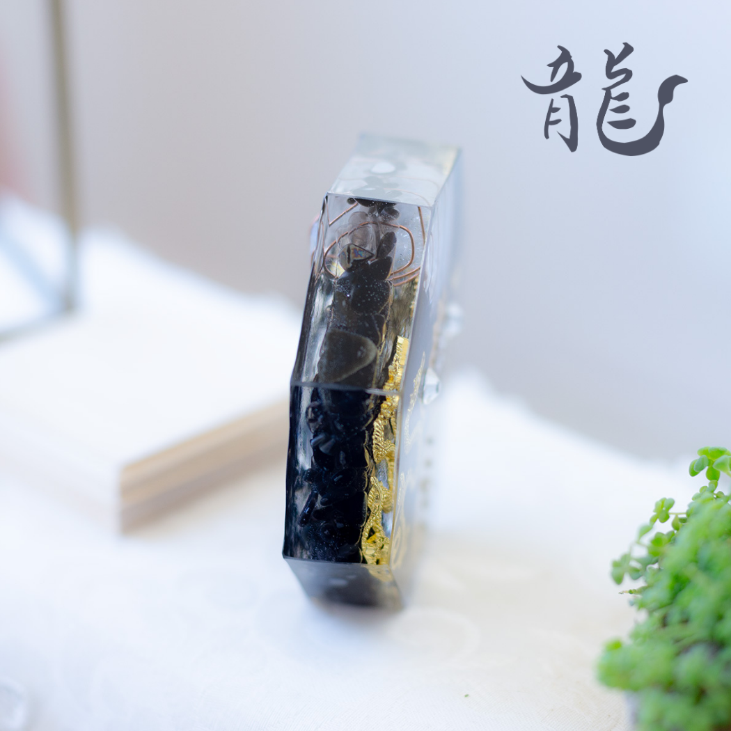 黒水晶モリオンが放つ「強力な浄化」と、金龍の「陽のエネルギー」を融合した八角オルゴナイト。