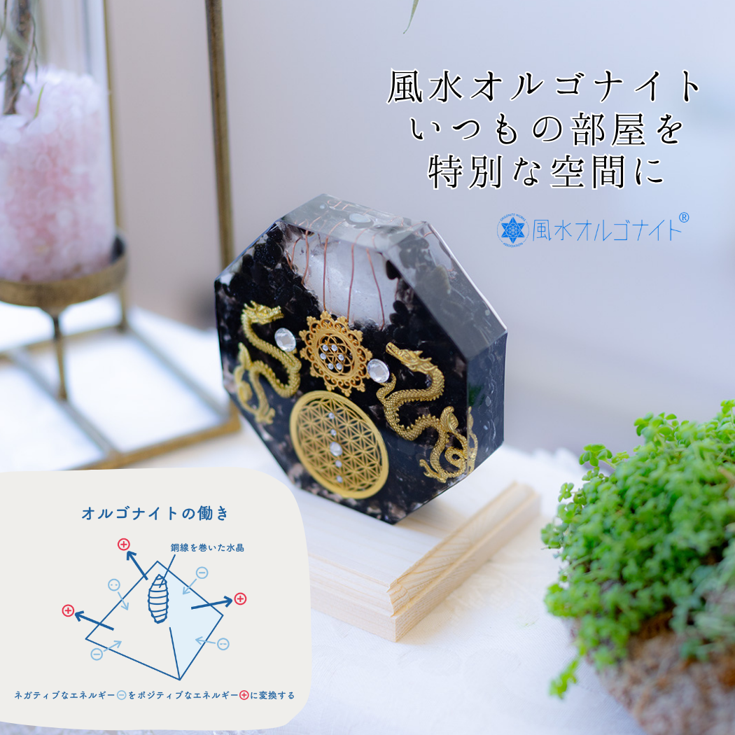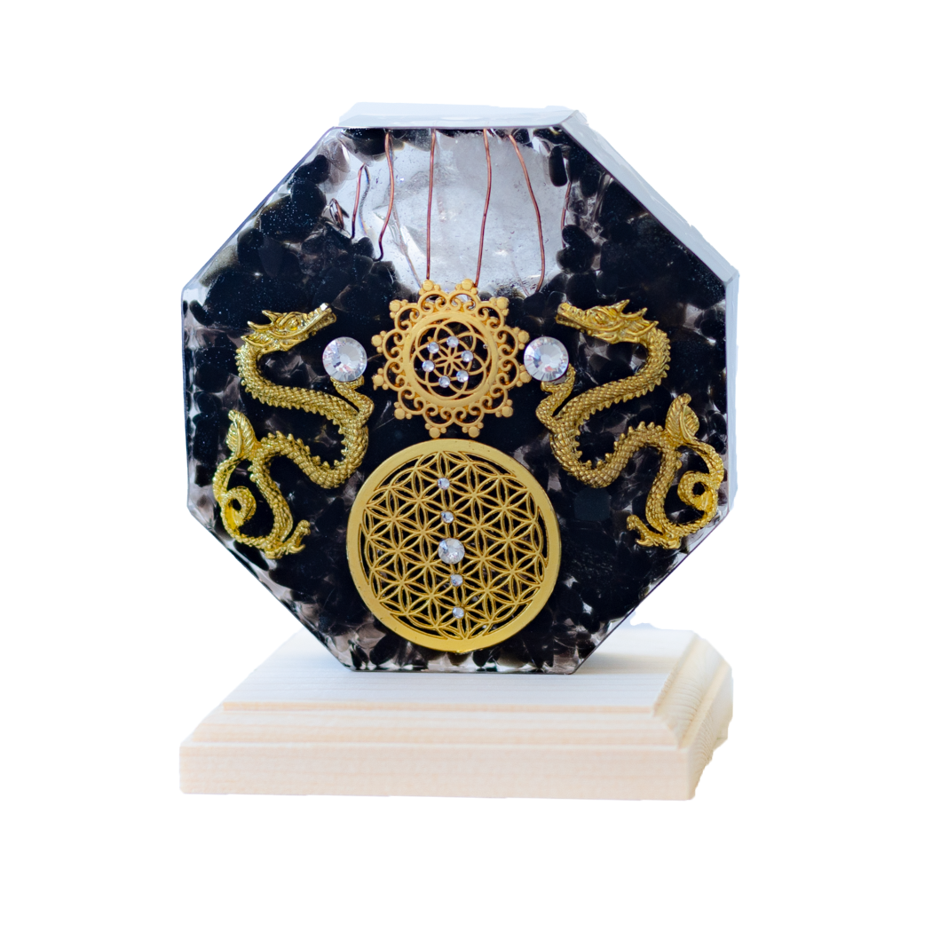 金龍 モリオン 風水 オルゴナイト 八角形 台座付き 開運インテリア 魔除け 金運上昇 空間浄化 フラワーオブライフ 黒水晶 双龍 受注製作 7日間
